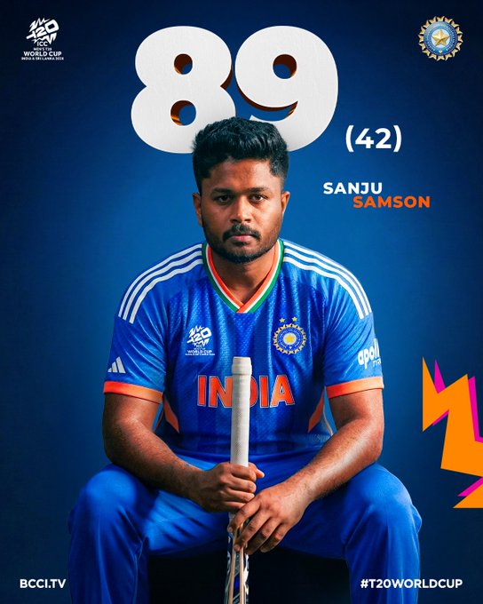 Sanju Samson anchored the innings with 89 runs off 42 balls, striking eight fours and seven sixes at a strike rate of 211.90. His aggressive approach helped India recover from an early setback after Abhishek Sharma departed for 9 in the second over.